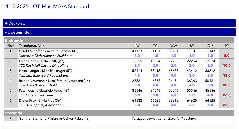 In der Startklasse Masters IV Standard überzeugte das Paar mit einer konstant starken Leistung über alle Tänze hinweg und setzte sich souverän gegen ein hochklassiges Teilnehmerfeld durch. Am Ende wurden Harald und Waltraud Schöfer mit dem 1. Platz belohnt und konnten den Advents-Pokal in ihrer Klasse für sich entscheiden.
