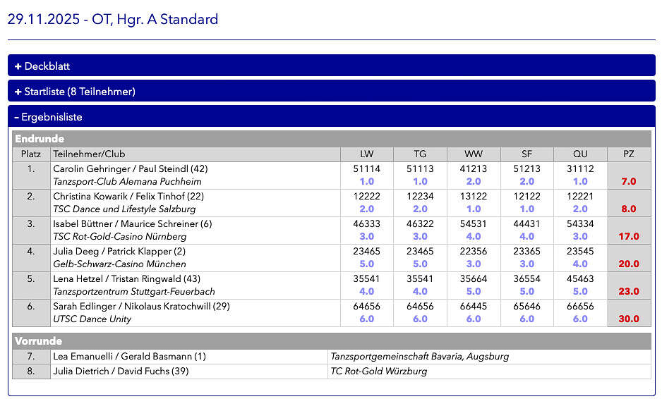 Am 29. November 2025 fand im Rahmen des Alpenseminars das Bayernpokalfinale der Hauptgruppen im Kurhaus Bad Aibling statt. Dort traten die besten Paare der Bayernpokal-Serie in zahlreichen Standard- und Latein-Klassen gegeneinander an. In der Hauptgruppe A Standard gelang es Paul Steindl und Carolin Gehringer, sich im starken Teilnehmerfeld durchzusetzen und den 1. Platz zu ertanzen. Dieser Sieg bei einem der abschließenden Ranglistenturniere der Saison war ein weiterer Beleg ihrer konstant hohen Leistung über das gesamte Jahr. ltvb.de